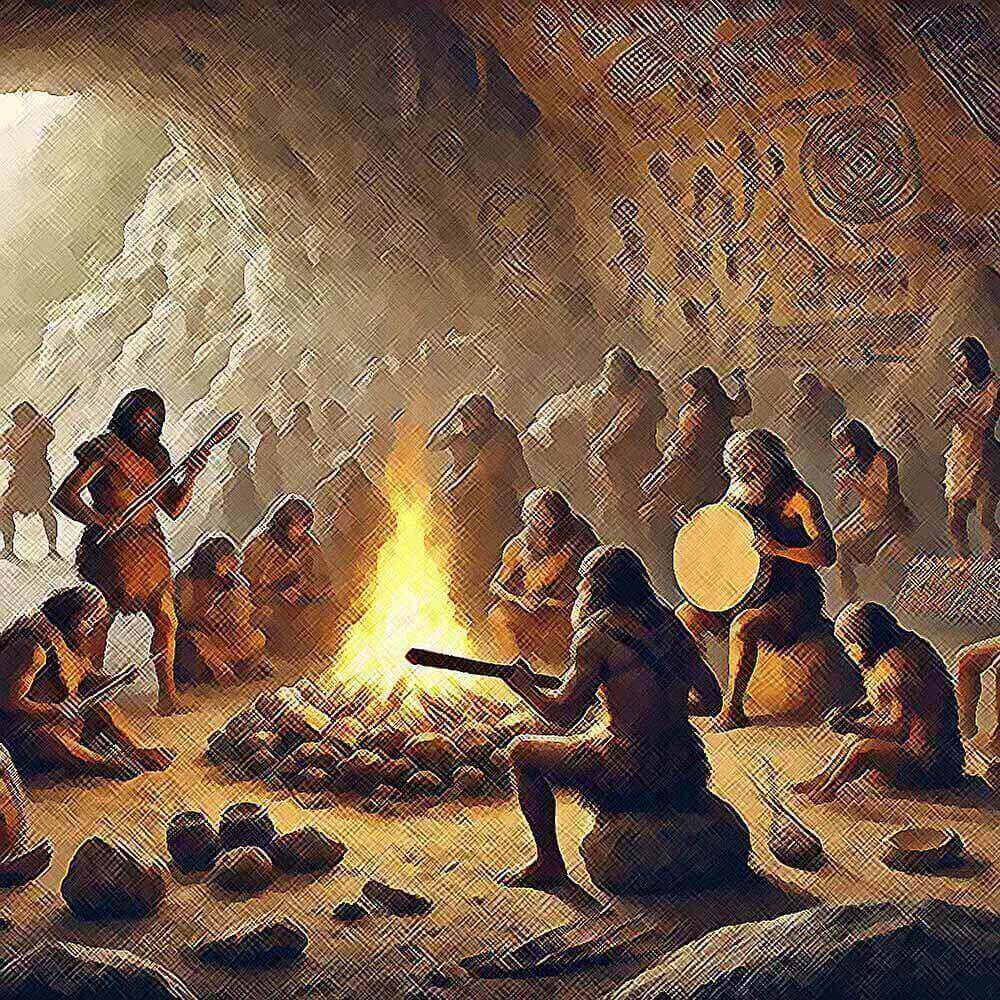 Criação dos primeiros instrumentos musicais para imitar os sons naturais. Desenvolvimento da linguagem falada e do canto.